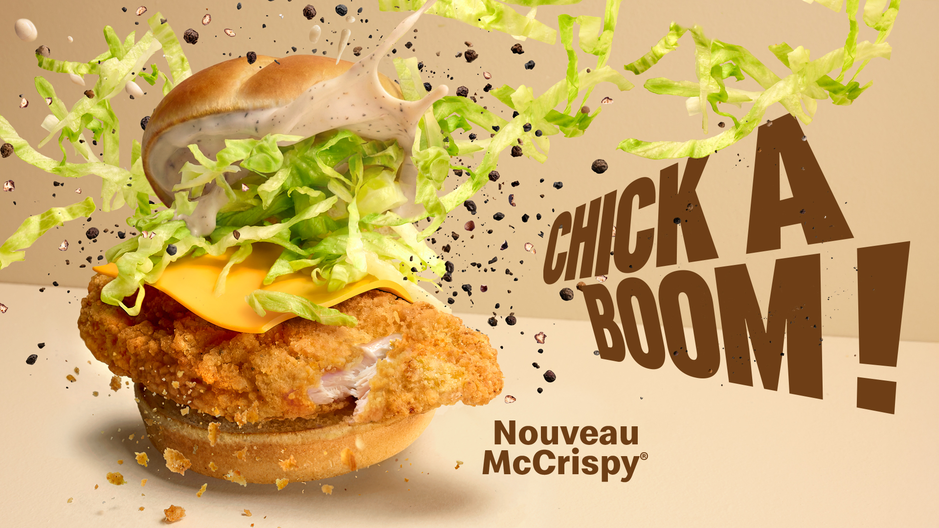 Ce que les 4 nouveaux produits au poulet de McDo ont en commun ? Un goût incroyable. Un poulet étonnant, délicieux, qui ne ressemble à rien de connu. C'est de ce constat qu'est né Chick-A-Boom, la nouvelle plateforme poulet de McDonald's signée TBWA. Le poulet de McDonald's, c'est une sorte de braingasm. Ça explose en bouche. Après la première bouchée, vous êtes ailleurs, vous êtes carrément secoué.