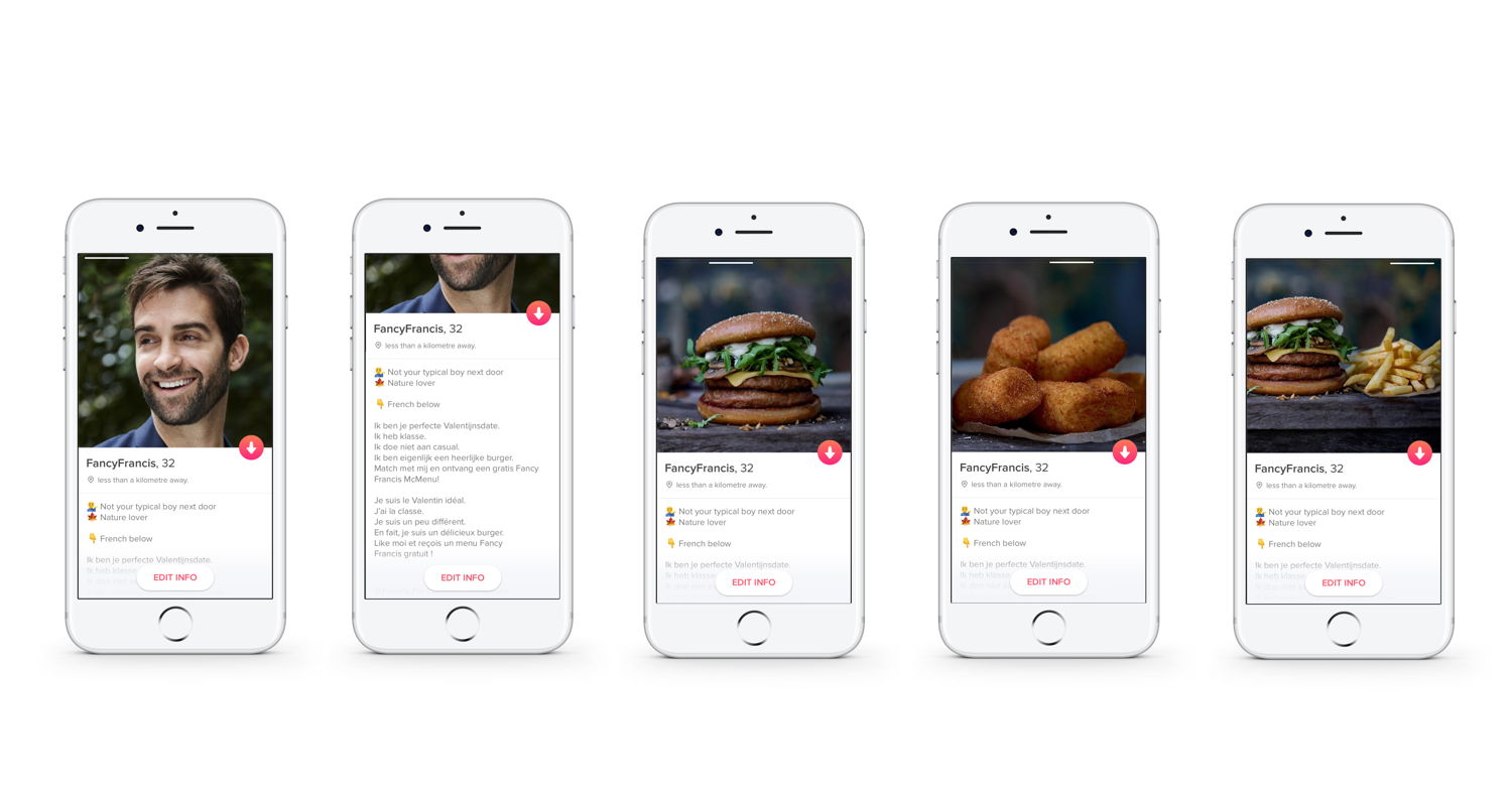Peut-on tomber amoureux d’un burger ? Chez McDonald’s, la réponse est OUI. Grâce à Tinder, la célèbre app de dating. À la recherche du partenaire idéal pour la Saint-Valentin ? Sur Tinder, vous pourriez bien matcher avec Generous Jacqueline ou Fancy Francis. Tous les deux… à croquer !