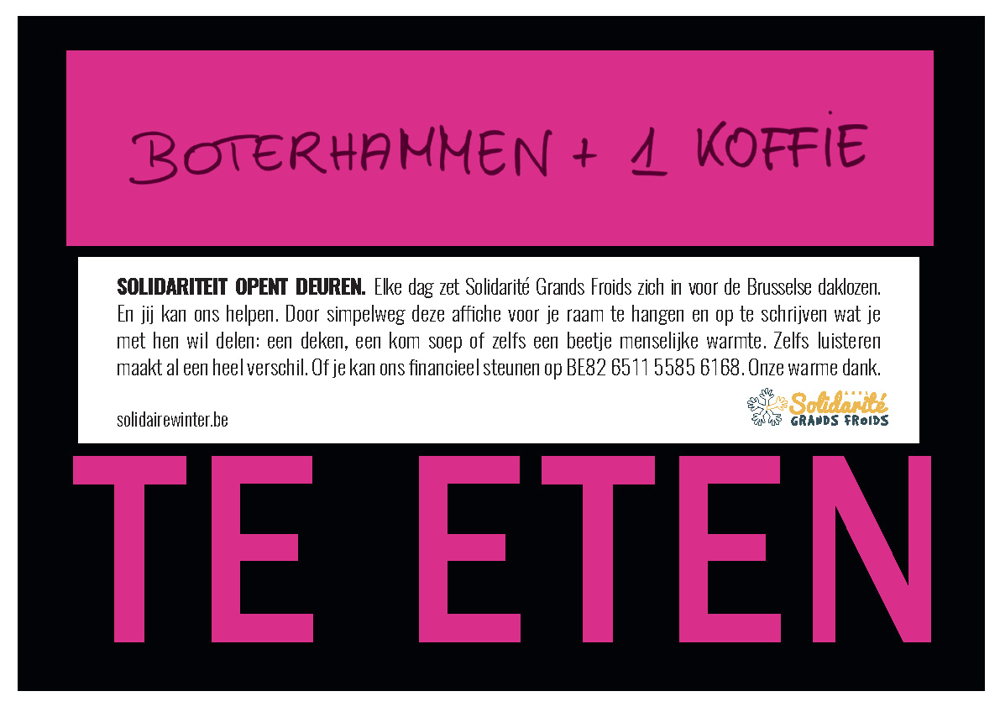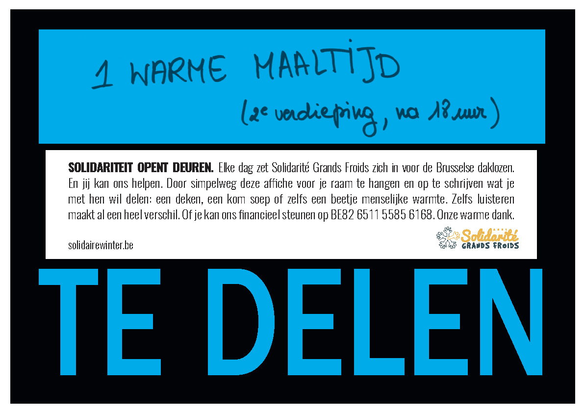 Met de sensibiliseringscampagne nodigt Solidarité Grands Froids Brussselaars uit om actie te ondernemen. Voor deze gelegenheid tovert de vzw de bekende neon affiches ‘te huur’ en ‘te koop’ om tot affiches met daarop ‘te eten’, ‘te delen’ en ‘te krijgen’ geprint. Zo worden de inwoners aangespoord om op het bovenste deel van de affiche te schrijven wat ze willen delen met daklozen: een deken, een jas, speelgoed, koffie, een warme maaltijd… Daarna kunnen ze de affiche aan hun raam hangen en zo deelnemen aan de actie.