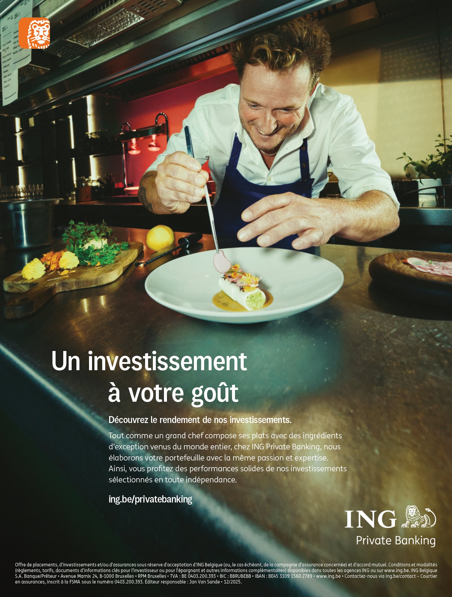 Dans cette campagne, le Private Banker ING est comparé à un grand chef qui sélectionne les meilleurs ingrédients aux quatre coins du monde. Mais ici, il s’agit d’un menu d’investissement de haut niveau, mêlant expertise financière et service personnalisé. Tout comme un chef recherche l’équilibre parfait entre les saveurs, le Private Banker compose un portefeuille équilibré pour chaque client, en dosant parfaitement le mélange de ses investissements.