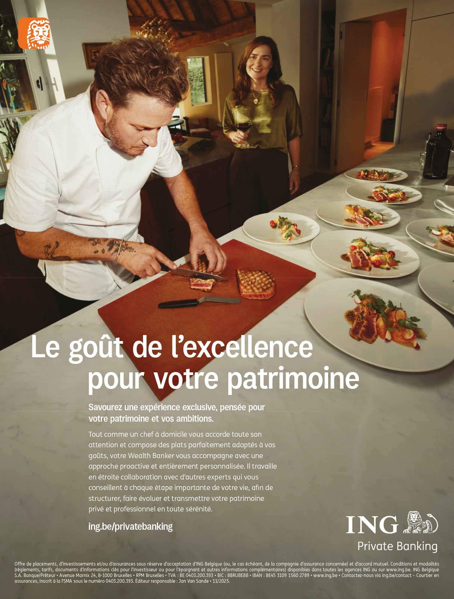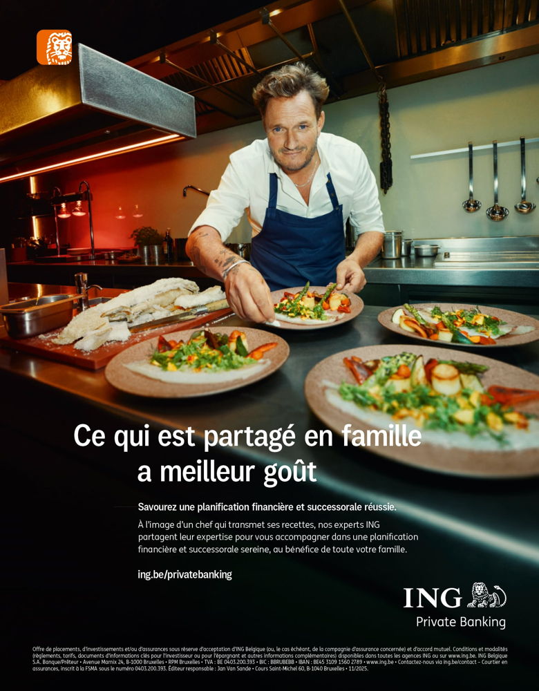 Et parce qu’aucun restaurant étoilé ne serait complet sans son sommelier ou son équipe en cuisine, le Private Banker s’entoure d’experts spécialisés qui assurent les meilleurs accords de services. D’accompagnement auprès des entreprises familiales à la planification successorale en passant par le service hautement personnalisé du Wealth Management. Ce dernier exemple est d’ailleurs symbolisé par un grand chef qui offre ses services à domicile pour ses clients exclusifs. Une métaphore de la proximité et de l’attention sur mesure offertes par ING Private Banking.