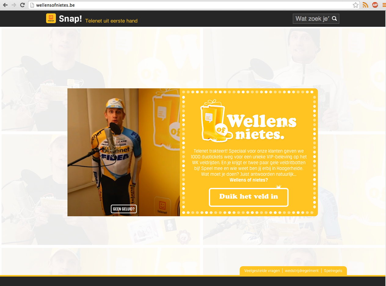 Op zondag 2 februari strijden de tenoren van het veldrijden voor de titel op het Wereldkampioenschap in Hoogerheide. Om dit spektakel eens van dichtbij mee te maken kan je meedoen met “Wellens of nietes”. Een online video-kwis speciaal voor alle Telenet-klanten, met niemand minder dan Bart Wellens als kwismaster.